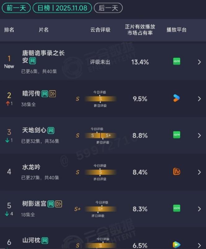 我们都知道,一部剧刚开播时,正片有效播放市场占有率是比较低的,随着剧情更新,占比会慢慢提高,但有些剧开播就没有获得较高的关注,就像《山河枕》,这部剧的正片有效播放市场占有率始终没有破10%,而《唐朝诡事录之长安》刚开播,占有率就高达13.4%。